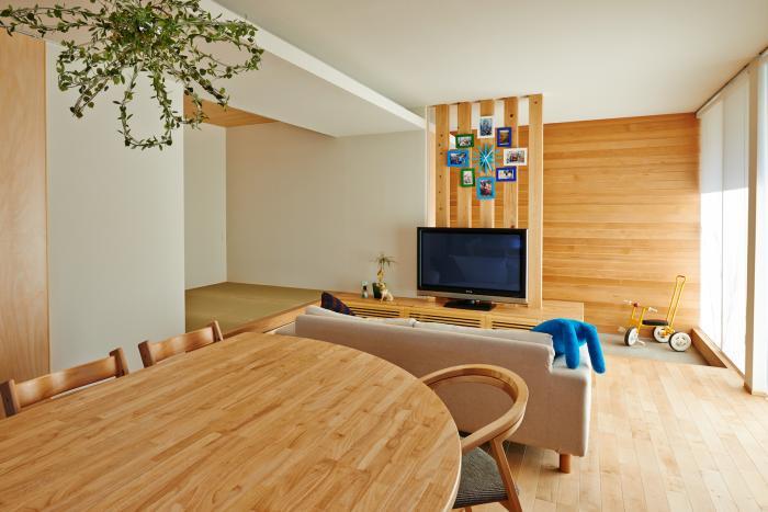 玄関からリビングまで仕切りのない開放的な連続空間とし、
