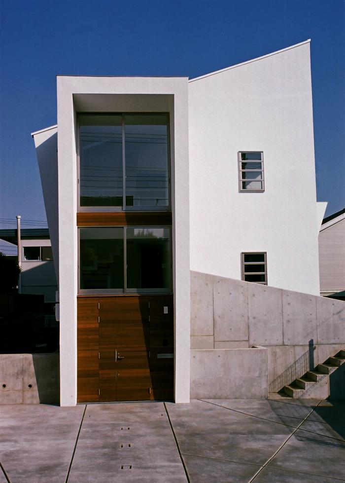 敷地と道路に高低差があったのでそれをどのように対処するか。玄関を非日常的なギャラリーの様な空間にして趣味のバイクをオブジェの様に置きたい。