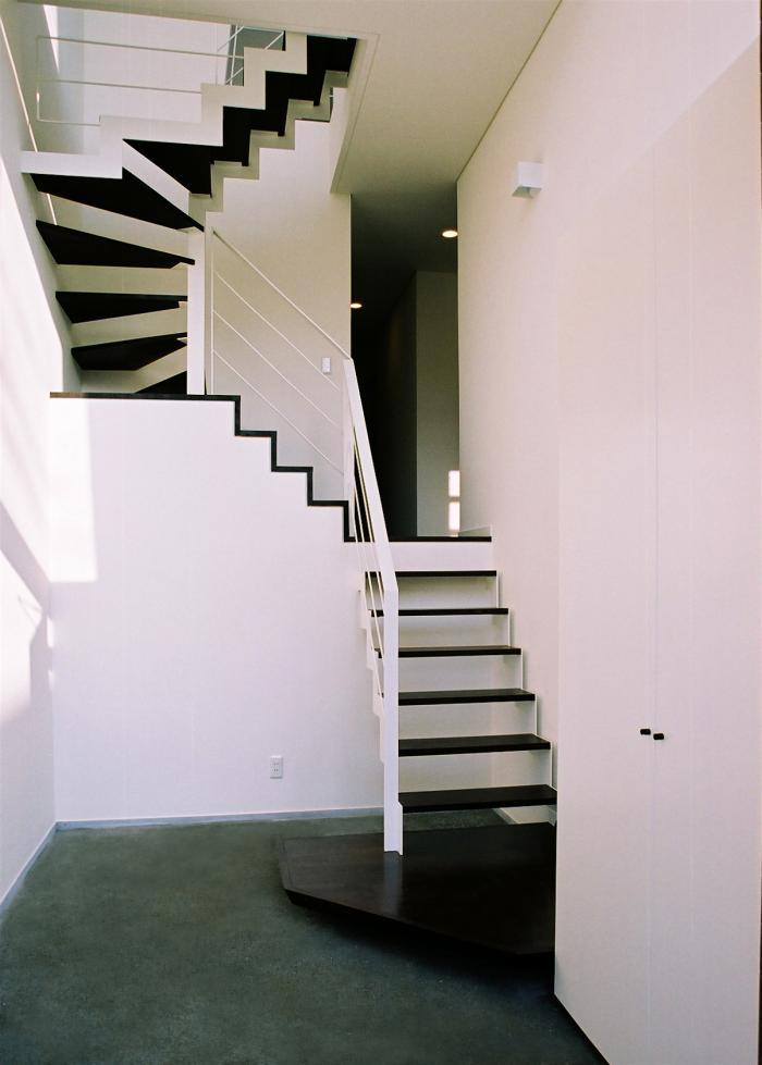 玄関吹抜け、階段室、2階のLDK吹抜けと空間的にも連続させて、ひとつの大空間を演出し、通風、日照の確保にもこだわっています。