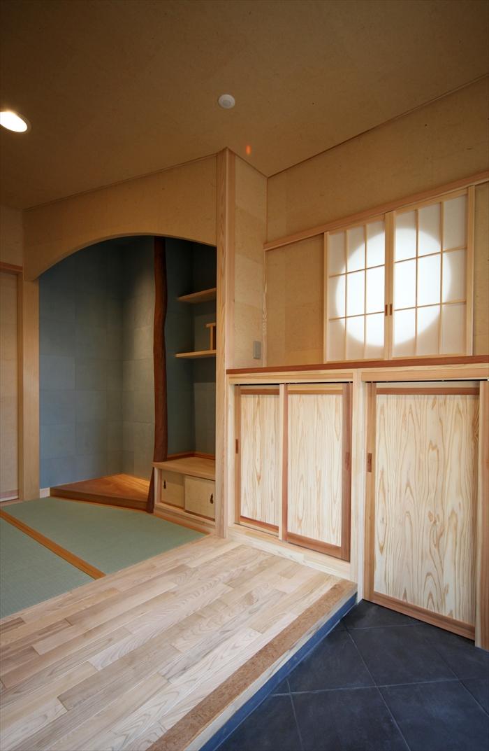 壁と同じ和紙を張った建具のコートや小物収納が機能的に配置されています。