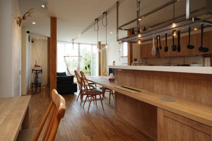 ご要望は白を基調にしたシンプルな家で、キッチンを家族と楽しめる様に、また、天井から吊ってあるものが好きというご要望を頂きました。