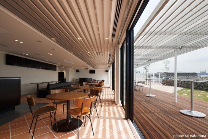 ボートレース丸亀既存建物内の部分改修による特別観覧施設/カフェ。室内とパーゴラで覆われたテラスが連続します。