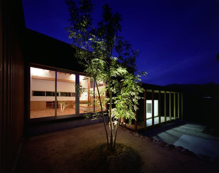 ハレの空間(来客スペース)を南、ケの空間(生活スペース)を北に配置し、玄関を挟んで明確に分けることで動線が交錯ことを無くしました。ケの空間は憩いの場としてのリビングを中心に配置し、西に個室群、東に水廻りと主寝室を配置しました。また、敷地が西から東に傾斜しているのを利用してスキップフロアとし、冬の吹き上げる北風対策の為、平屋に近いプランとしました。このような「敷地に逆らわない」構成とすることで生じる床高と天井高の違いにより、各部屋にふさわしい空間ができ、また、各部分での多様な景観や四季の変化を取り込む仕掛けが、日々の生活の中でゆとりをもたらしています。
