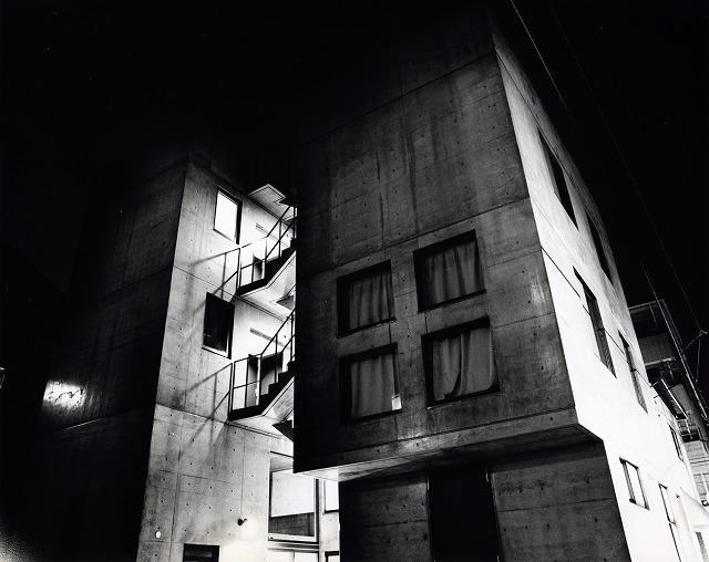 建物は、吹き抜けを持つコートを挟んで2つのコンクリートの箱が建つ形状を持ち、外階段がつなぐ構造となっている。
