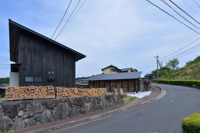 本計画は日田市郊外の数年前に開発された造成地に位置するが、まだかなりの未整備の空地が残っている状態であった。そのため焼杉を全外壁に採用し新しい景観を創造することを意図した。この焼杉はクライアント、学生達とワークショップを行い製作したものである。また薪ストーブの保管用薪を塀のように周囲に積んで柔らかい雰囲気を演出した。
