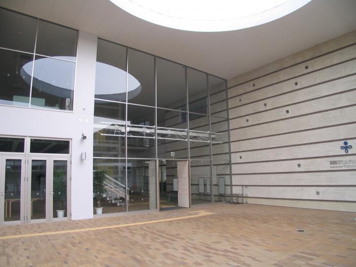 L型に講義室、事務室等を配置し矩形の屋根をかけて広々とした屋外スペースを確保した本館、キャンパス北側の正門にむかって迎える形にしたいとの学校側の要望からこの形状が決まりました。建物北側の広場に日照をとるために屋根に丸い穴を開けました。