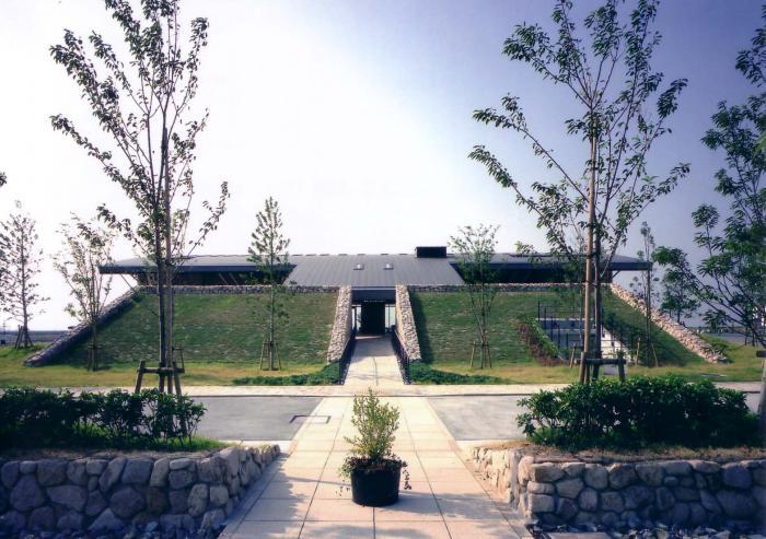 駐車場側は屋上緑化された斜面で建物が隠されている