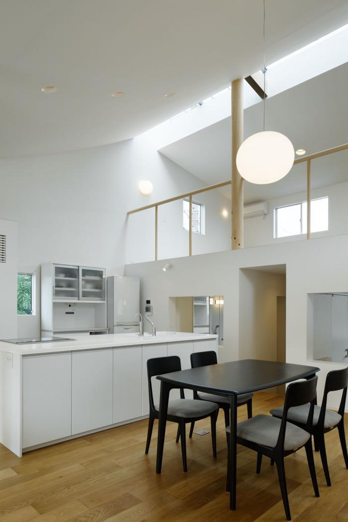 敷地は、低層の住宅が連なり周囲が開けた高台の角地。 最初の施主へのヒアリングより、効率的な導線でありつつも、 大きな一繋がりの柔らかな空間がふさわしいと考えた。 平面的にはシンプルで機能的な間取りとしつつ、 奥に向かって緩やかに下がる敷地形状に合わせ、内部の寝室、水廻りのレベルを ダイニングより下げて配置。 そのため、将来は2室に仕切って使える上部ロフト空間も、 ダイニングから手の届くような高さに下げてレイアウト。 さらに、寝室と洗面のダイニング側に開閉可能な窓を設置。 これらの操作により、 建物のどこにいてもお互いの気配が常に身近に感じ取る事ができる。 北側棟付近にスリット状のトップライトを設け、 そこから差し込む光を室内の隅々まで拡散させる為、 天井を緩やかにカーブさせる。 柱や手摺、掘込まれたダウンライトや意匠照明の形状が、 天井ラインに同調し、柔らかな空気感を醸し出す。 施主は塗料の卸会社勤務であったため、 施主のショールームにもなればという意図もあり、 内部は空気を奇麗にする塗装、