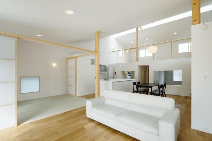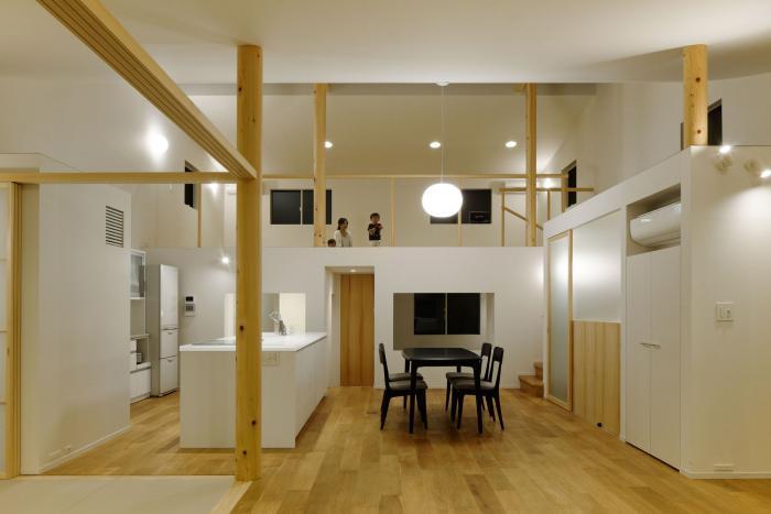室内は見通しの良い一体空間で、誰がどこで何をしていても気配を感じられるように工夫されている。天井の柔らかな曲線は体が包まれているような感じを覚え、上部の天窓から差し込む光が気持ちがよい。特にキッチンで料理をしていると、旦那や子供が他の部屋で何かをしていても気配が感じられ、個室に引きこもって会話が無い事も無いので良い。