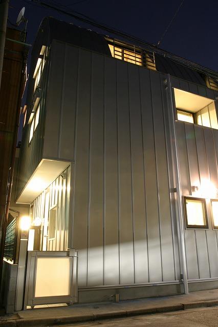 シルバーのガルバリウムで全体を覆った、3階建ての木造住宅です。