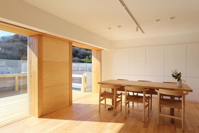 足利のリノベーション LDKです。間仕切りの壁は撤去し、内部の広がりをつくりました。またアルミサッシを大きな木製サッシに変更し、木製デッキをつくることで、内部と外部がより滑らかに連続することを意図しました。