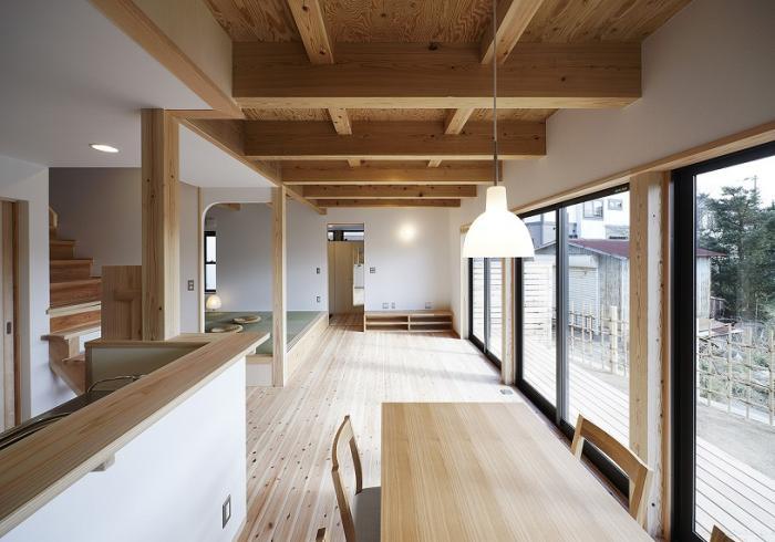 リビングダイニングを設けた1階は小上りの和室を携えたワンルーム空間です。大きな窓からは明るい陽射しが射し込みます。