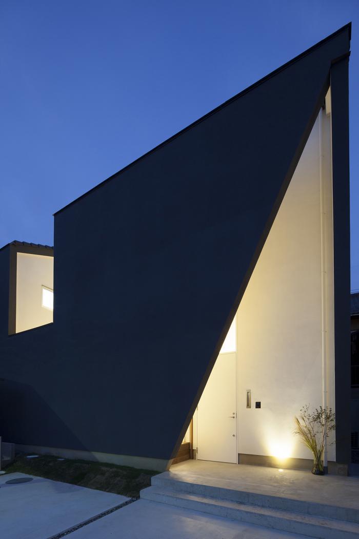 愛知県の犬山城へと続く本町通りから少し外れた敷地に建つこの住宅は、どことなく城下町にある「蔵」の雰囲気を感じさせています。四角い箱から三角状に切り落とした部分を玄関ポーチと兼ねることでシンプルで印象的な外観としました。内部は1Fを共用スペース、2Fをプライベートスペースとしています。西側以外は建物に囲まれており、室内に自然光が入りずらいですが、中庭(光庭)を設け、そこから入る自然光と壁面反射光により、外観とは対照的な明るく解放的な室内になっています。また各スペースを階段で徐々に上がっていく「登り窯」のような空間構成とし、横に伸びる空間(LDK)と縦に伸びる空間(吹抜け・テラス・中庭)を繋ぐことで空間に広がりを持たせ、段差によって変化する天井高が空間全体にメリハリを付けています。