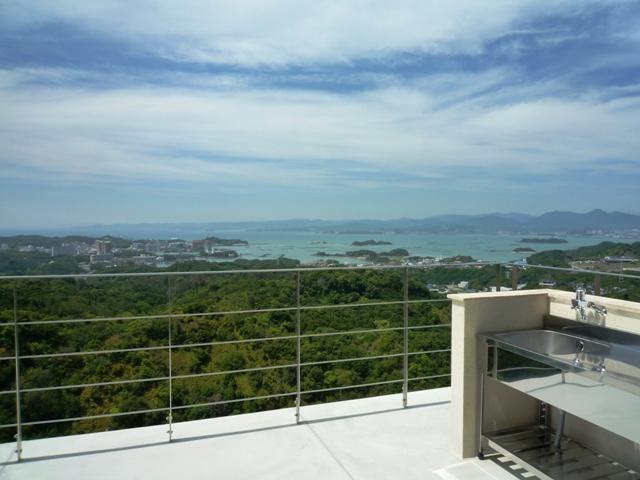 青い海原を眼下に望む高台の邸宅。景勝地の風雅な眺めを住まいに取り込み、日常離れしたリゾートテイストとくつろぎ感を日々存分に満喫したい。そんな建て主の要望にお応えしたのが今回のプランでした。 まずポイントとなるのは高台の傾斜地を最大に活かした構造躯体とレイアウト。2階をみんなでくつろぐパブリックスペースと位置づけ、玄関とLDKを配置。一方、3階と1階にはプライベートスペースとしての個室や和室を配置し、家族が一緒に過ごす時間はもちろん、個々の時間も気兼ねなく過ごせるように配慮しました。2階のリビング続きにはRC造の強靭な構造を活かして幅4mものフロアデッキを張り出し、さらに2階3階の北西の壁面を開口にすることで、デッキにいる時はもちろん、リビングにいながらも雄大な海原の風景に溶け込むような開放感と安らぎを満喫できるようにしています。また、せっかくの景観を損ねないようにデッキの手すりには細いワイヤーを採用。さらに温泉を引いた浴室は2壁面全開口の岩風呂にし露天風呂のように楽しめる趣向にするなど、ぜいたくな時間と空間を普段着感覚で堪能できる工夫を満載しました。