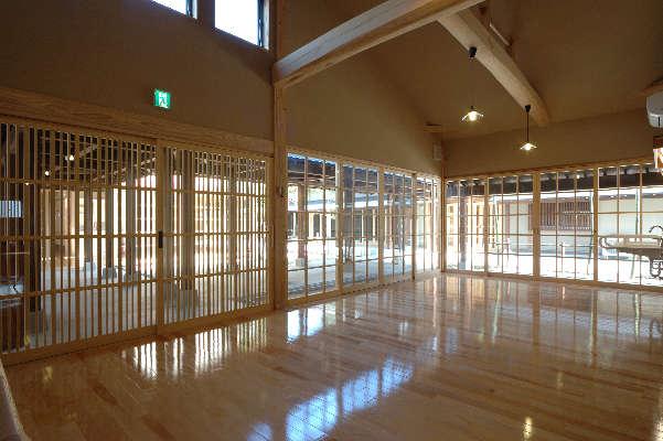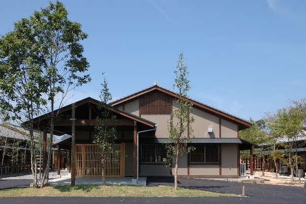 京都の木造長屋、または昔の木造校舎の雰囲気の落ち着く施設で各部屋からお庭の見える自分のお家に居るような施設としたいという要望がありコンペで優勝して完成した施設です。素材は屋根は和瓦(粘土瓦)壁は土壁(スサ入り)などこだわり、八代の土地がら(イグサの生産地)で畳(事務所に採用)を採用したり工夫した施設としました。