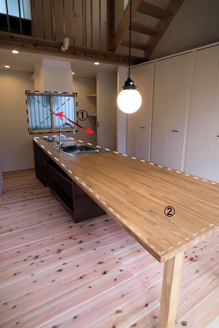 キッチン部とダイニング部のカウンター高さが違うため床に段差を設けてカウンターを1枚で設置できるよう工夫している。キッチン北側は南北通風とキッチン排熱のための大切な採光換気窓です。