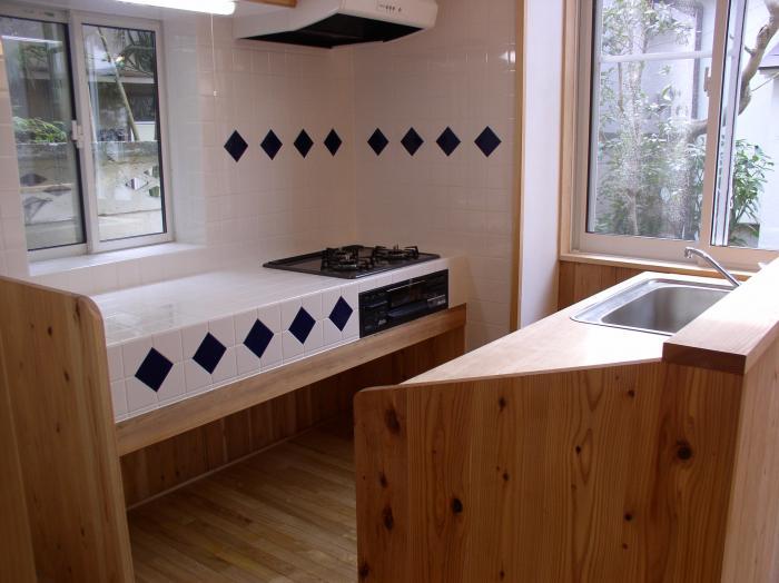 木やタイルを使ったオーダーメイドのキッチンです。大きな出窓に面しているので、とても明るいキッチンに。