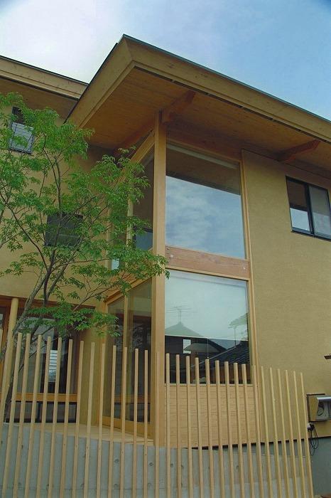 設計した住宅です。外壁は土や小石などを配合して独自の掻き落とし左官壁を作りました。