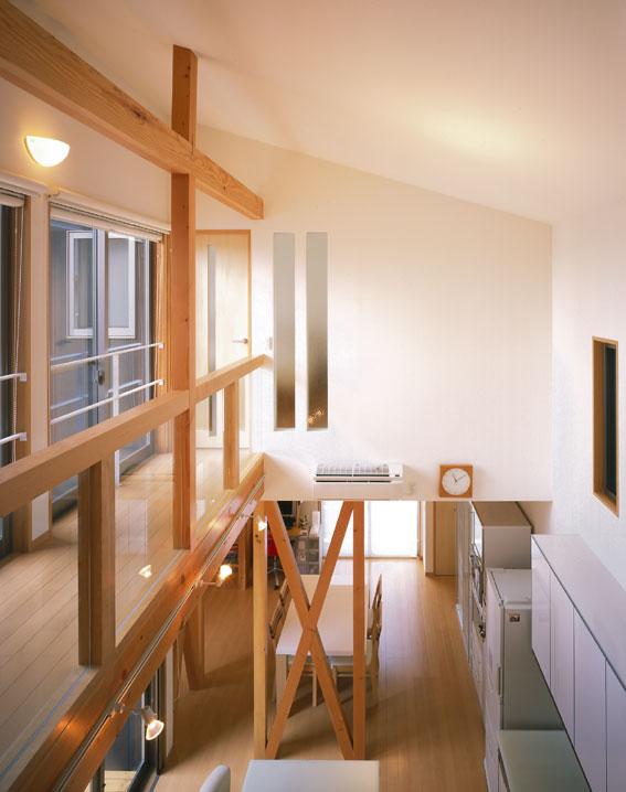 ダイニングからキッチンを見た所です。壁をつけずに柱と筋交いだけを見せて、空間の一体化を計っています。