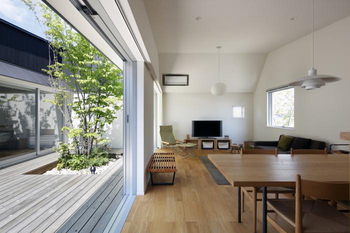 道路側にLDK、中庭を挟んで寝室、子供部屋を配し、そのつなぎ部分を玄関、水まわりとしたいたってシンプルなプランニングとし、わずか23坪程の家ではあるが、30坪、2階建の住宅よりもはるかに開放的な心地のいい空間を獲得することに成功した。また外部の仕上げ材の焼き杉板は、周辺の古くからの民家にはよく使用されている素材で、田園風景との調和を意識して採用したが、従来の板幅の半分で特注生産し、少しモダンな新しいデザインを提案している。季節のいい日はLDKに大きく開けられた開口部の建具を両側の壁に引き込み、外からの視線を気にすることなく庭の自然を生活空間に完全に取り込むことが可能で、それによって得られる住まいの豊かさは格別なものとなった。
