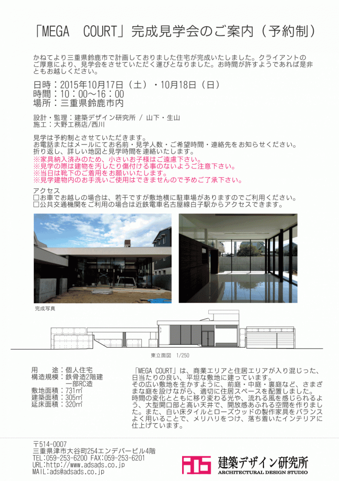 かねてより三重県鈴鹿市で計画しておりました住宅が完成いたしました。クライアントのご厚意により、見学会をさせていただく運びとなりました。お時間が許すようであれば是非ともお越し下さい。