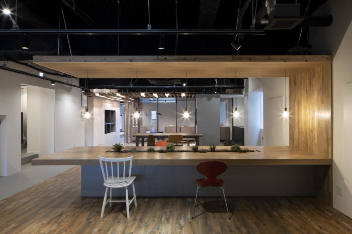 JR藤沢駅北口からペデストリアンデッキに繋がる9階建てのテナントビルの1階から3階EVホールの改修。クライアントの要望は、木材を利用し、外部とのギャップを創り出すこと。
