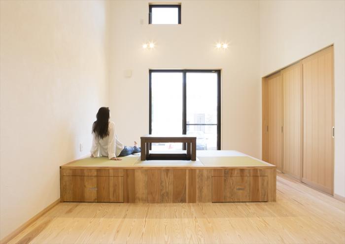 仕事帰りにお子さんと帰宅後に、全ての家事を行えるよう、1階に寝室、将来的なお子さんの部屋を配し、2階に水廻り+リビングダイニングを計画しました。南北に長い敷地を活かし、2階はワンルーム的に扱い、南北の風の通りを良くしています。 |