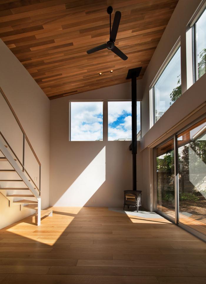 川越市、武蔵野の面影を残す雑木林「森のさんぽ道」にほど近い場所に建つ25坪の住宅。少し歩けば非常に濃い緑が望める素晴らしい環境に建つ。敷地は南側に隣家が背って建っており、南側の景色は望めない環境であった。