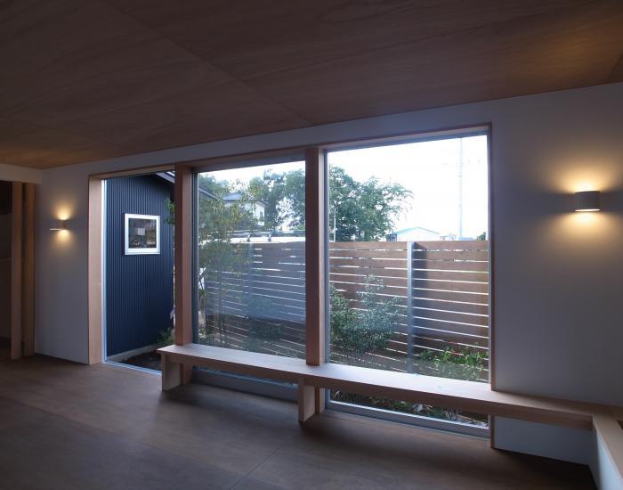 川越市、武蔵野の面影を残す雑木林「森のさんぽ道」にほど近い場所に建つ25坪の住宅。少し歩けば非常に濃い緑が望める素晴らしい環境に建つ。敷地は南側に隣家が背って建っており、南側の景色は望めない環境であった。