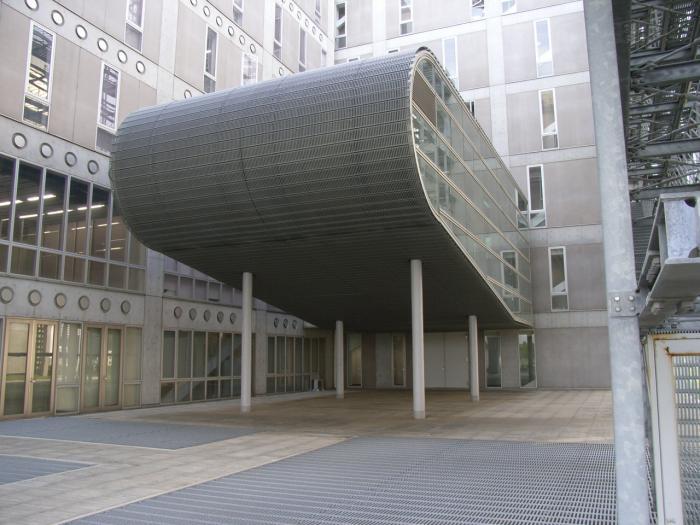 キャンパス計画に沿った配置計画の中で、東西に連なるピロティと、実験室に必要な設備配管を集約したメカニカルシャフトと各実験室内に配管を通すためのPCスラブによる構造体などの工夫により、実験施設として柔軟に対応できると同時に、多くの研究室を収容する中での動線計画に配慮しました。 |