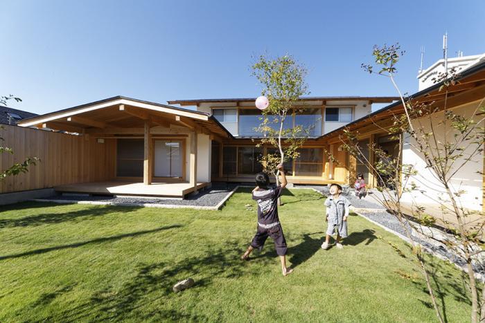 施主は小学生・幼稚園児2人の子供を持つ若夫婦。未来あふれる家族にとってもっとも長い時間を過ごす我が家を設計するに当たり、コの字型の外形の中央に室内と同じレベルでアクセスできるデッキテラスを計画しました。 |