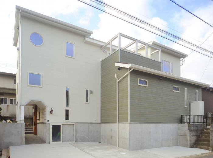 外観はオーソドックスなシンプルイメージを希望されていました。片流れの屋根、玄関アプローチのピロティー、北側2階のルーフバルコニーは、内部間取りと空間構成から自ずと形になったものです。