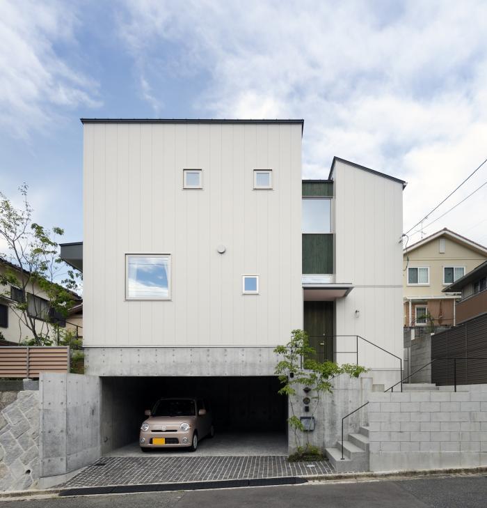 愛知県の犬山城へと続く本町通りから少し外れた敷地に建つこの住宅は、どことなく城下町にある「蔵」の雰囲気を感じさせています。四角い箱から三角状に切り落とした部分を玄関ポーチと兼ねることでシンプルで印象的な外観としました。内部は1Fを共用スペース、2Fをプライベートスペースとしています。 |
