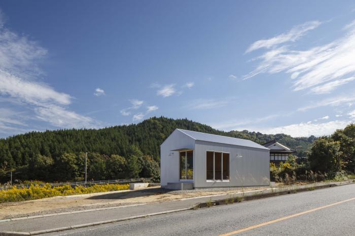 東広島市南部の山間へ新築した厨房を持つテイクアウト式の店舗。敷地は市街化調整区域内に位置するため周囲にはのどかな風景が広がり、街中よりもずっと空が大きく見える。初めて敷地を訪れた時、主役としての建築ではなく、風景や暮らしの中で黒子として佇む建築を作るべきだと考えた。