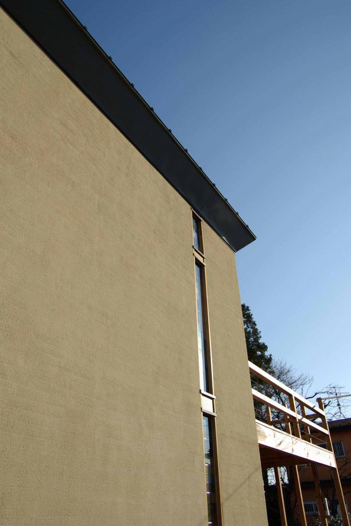 前貝塚町の家 変形した土地を逆手にとった配置で日照を確保し、散策路のようなアプローチ動線で敷地を繋ぐ計画です。建主待望の薪ストーブ、その余熱を床下から全体に循環させるシステムを採用しています。土間は残土を配合した三和土風仕上で、建主家族による自主工事です。 |