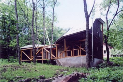<都幾川べりのハイブリッドハウス/Onさんの家>ときがわ町 都心から50㎞圏、埼玉県北西部を流れる一級河川都幾川(ときがわ)の渓流沿い、北岸に接した約220坪の敷地(原野、田畑を含む)に建つハイブリッド構造(鉄+木+ガラス)のガラスハウスです。 |