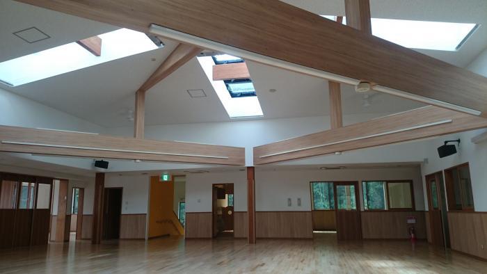 まことなるたきこども園 老朽化した保育園の建替えです。計画上園庭は、以前より小さくなってしまうため屋内の遊戯室を充実させました。保育室などの諸室は、外部に面して配置してその中央に大きな遊戯室を設けました。そのための採光や通風は、トップライトにより行っています。 |